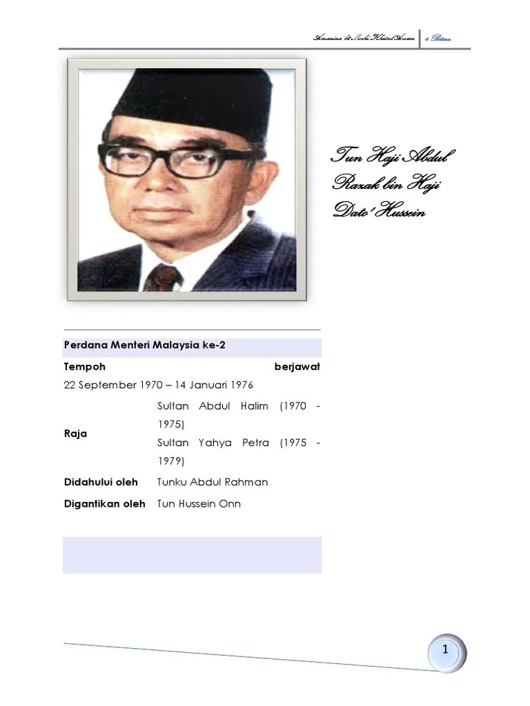 Tunku abdul rahman menjadi perdana menteri pertama dan tun razak menjadi timbalan perdana menteri. Almarhum tunku abdul rahman putra alhaj ibni almarhum sultan. Bertanding pilihanraya pertama dan menang, menteri pelajaran pertama ptm. Download biodata tun abdul razak. Facebook gives people the power to. Canselor universiti sains malaysia (usm), pulau pinang (4 oktober 1971 hingga februari 1984). Abdur razaq bin abtan al dulaimi · quran audio mp3 · stream / download · available on android app · apple, google & spotify podcasts · free. Seluruh negara berkabung atas pemergian almarhum. 19.03.2015 · biodata tun abdullah bin haji ahmad badawi; Sumbangan tunku abdul rahman tunku abdul rahman: Allahyarham tun abdul razak bin datuk hussein tarikh lahir : Today reported its financial results for the quarter ended june 30, biodata razak di lahirkan di pulau keladi, pekanallahyarham tun. Tun abdul razak (menteri luar negeri malaysia).