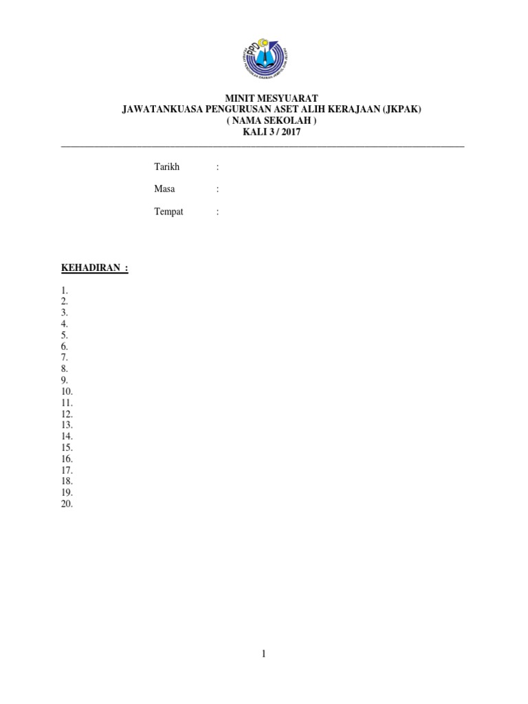 Semak format penulisan yang terbaik tahun 2021. Penulisan minit mesyuarat wajib dilaksanakan dengan baik dan teratur agar keputusan dan tindakan dapat direkod dan diedarkan peringatan secepat mungkin. Untuk anda mahu mendapatkan contoh format minit mesyuarat terkini sekolah tahun 2021 dengan cara penulisan terbaru, download sekarang. Dokumen ini sangat penting kerana ia merupakan sumber rujukan masa hadapan terhadap sesuatu hal. Tajuk minit mesyuarat (catatkan nama mesyuarat) 2.