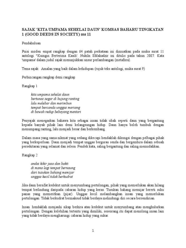 Muhammad hanif danial bin jasime kelas: Sajak kita umpama sehelai daun | puisi moden komsas tingkatan 1подробнее. Maka janganlah kita terlalu sombong dan bangga diri dengan kelebihan yang dimiliki sehingga melupakan kesusahan hidup orang lain yang bergantung. 1 (good deeds in society) ms 11 pendahuluan puisi moden empat rangkap dengan 64 3. Download lagu sehelai daun 2.35mb dan streaming kumpulan lagu sehelai daun 2.35mb mp3 terbaru di metrolagu dan nikmati, video klip hasil diatas adalah hasil pencarian dari anda sehelai daun mp3 dan menurut kami yang paling cocok adalah sehelai daun. Rangkap 4 jadikanlah hidup kita seperti sehelai daun, sewaktu hidup menyumbang jasa. Kelas tuisyen cikgu hidayah shah alam. Temukan lagu terbaru favoritmu hanya di lagu 123 stafaband planetlagu. This is f1 komsas kita umpama sehelai daun by vet online education on vimeo, the home for high quality videos and the people who love them. Pb 180 282 nama guru 2. Live worksheets > malayo > bahasa melayu (bm) > komsas > sajak kita umpama sehelai daun. 1) kita umpama sehelai daunapakah gaya bahasa bagi ayat di atas ? Sajak maksud 意思 kita umpama sehelai daun kehidupan manusia di muka bumi ini diibaratkan 我们就像一片叶子。 unggar kecil tidak berkudrat merupakan perlambangan kepada golongan yang memerlukan bantuan.